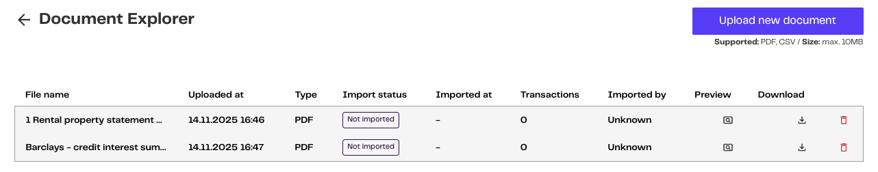 You can upload CSV-files such as bank statements and PDF files of documents like rental statements, P60's and dividends vouchers.
